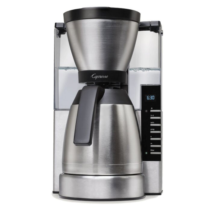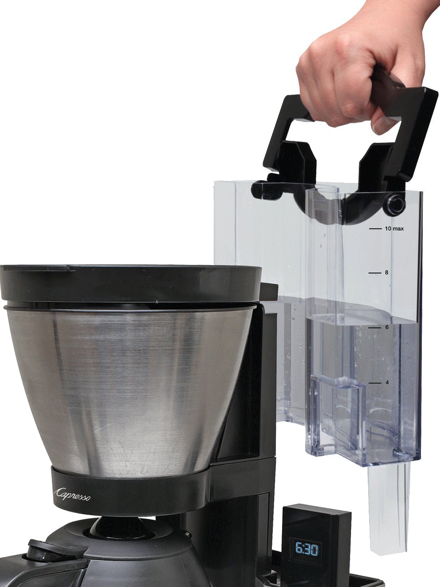 An upgrade to Capresso’s MT600 coffee maker. the MT900 features an updated LED Clock/Timer. a redesigned control panel. and a transparent water reservoir. Housed in elegant stainless steel. the MT900 can brew up to 10 cups of coffee in less than 7 minutes. You can program the timer to have the MT900 power on and brew at a time of your choosing. To extend the lifespan of your machine and protect the flavor of your coffee. the 50 oz water reservoir can be fitted with a charcoal water filter to filter up to 82% of impurities. The filter is actively monitored once installed and the coffee maker will alert you to change it once enough pots of coffee have been brewed.